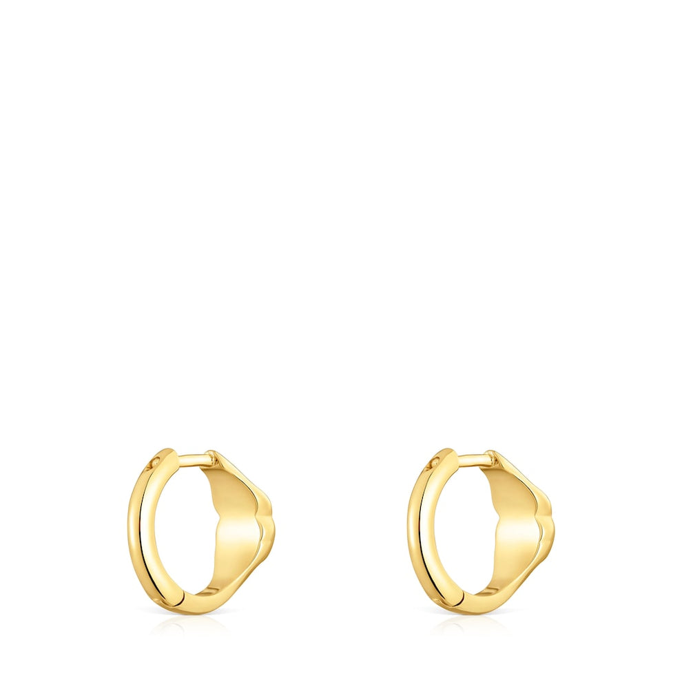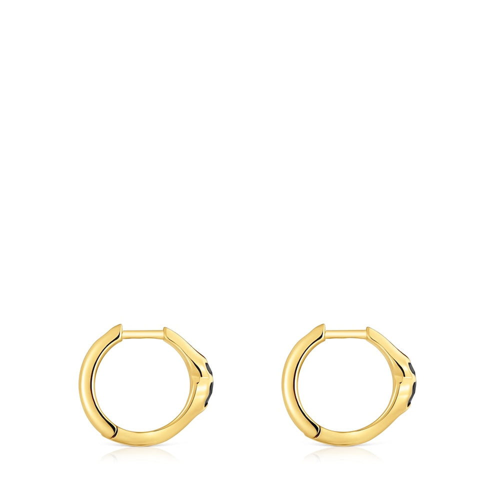 Icon Color hoop earrings with 18kt gold plating over silver and bear motifs in faceted onyx. Size of bear charm 6mm. Size of earrings 10mm. Piece made of sterling silver with 18to23kt gold plating with a thickness of 3microns. This quality guarantees a greater durability of the jewel.