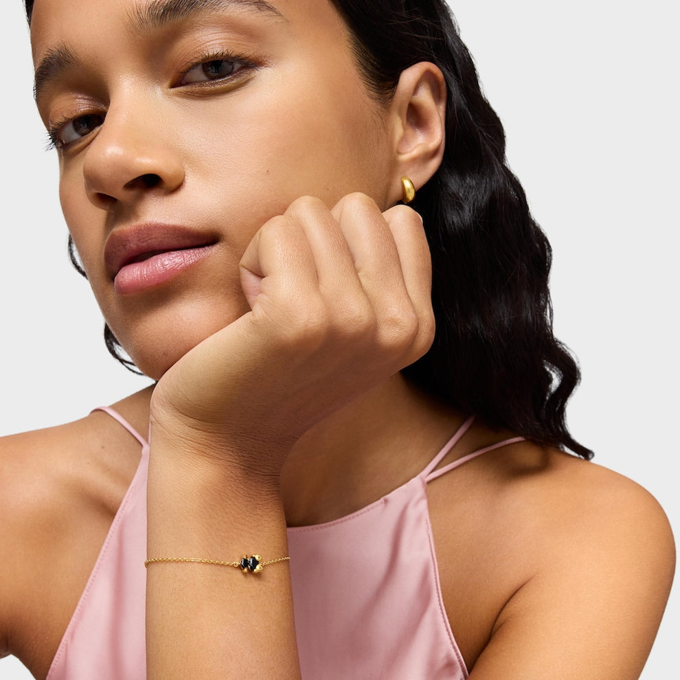 Color Bear chain bracelet with 18kt gold plating over silver and faceted oval-cut onyx in the shape of a bear. Motif size 8 mm. Bracelet length 23cm. Slider clasp. It is made of sterling silver with 18to23kt gold plating and has a thickness of 3microns. This quality guarantees the piece will have greater durability.