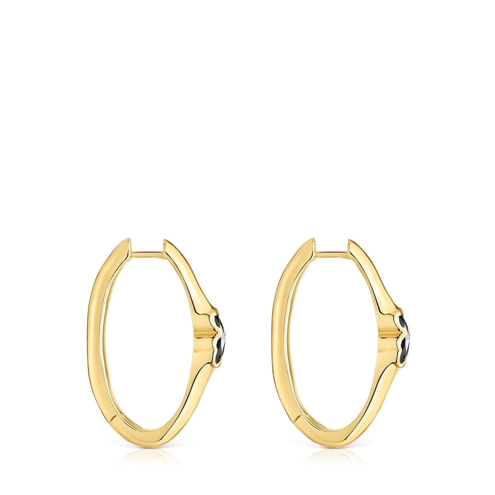 Icon Color hoop earrings with 18kt gold plating over silver and bear motifs in faceted onyx. Size of bear charm 8mm. Size of the earrings 26 x 13 mm. Piece made of sterling silver with 18to23kt gold plating with a thickness of 3microns. This quality guarantees a greater durability of the jewel.