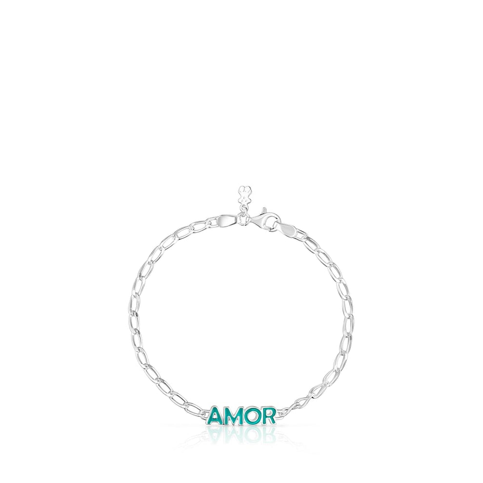 Crossword oval chain bracelet with AMOR motif in blue enamel.