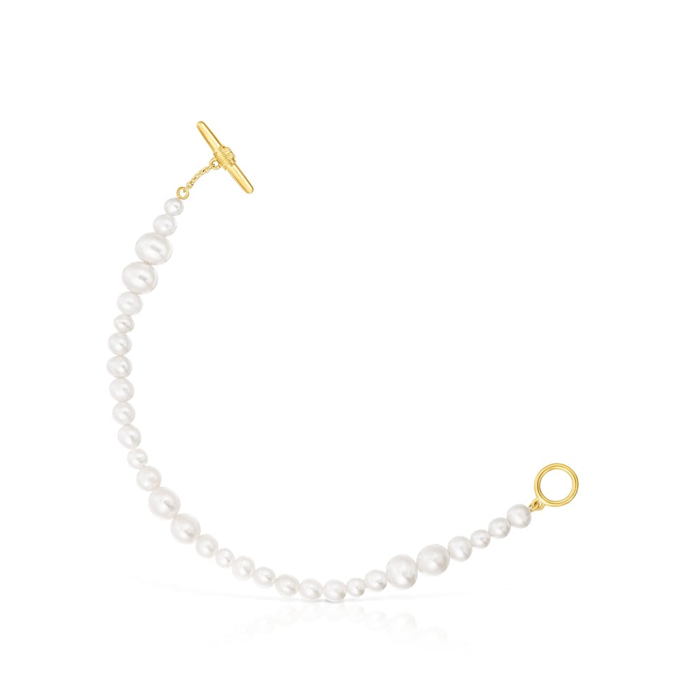 Lure bracelet made from cultured pearls with a silver vermeil clasp with 3mm bear detail in the center of the clasp. Motif size 20mm. Size of the cultured pearls 4-7mm. Bracelet length 17,5 cm. Toggle clasp.