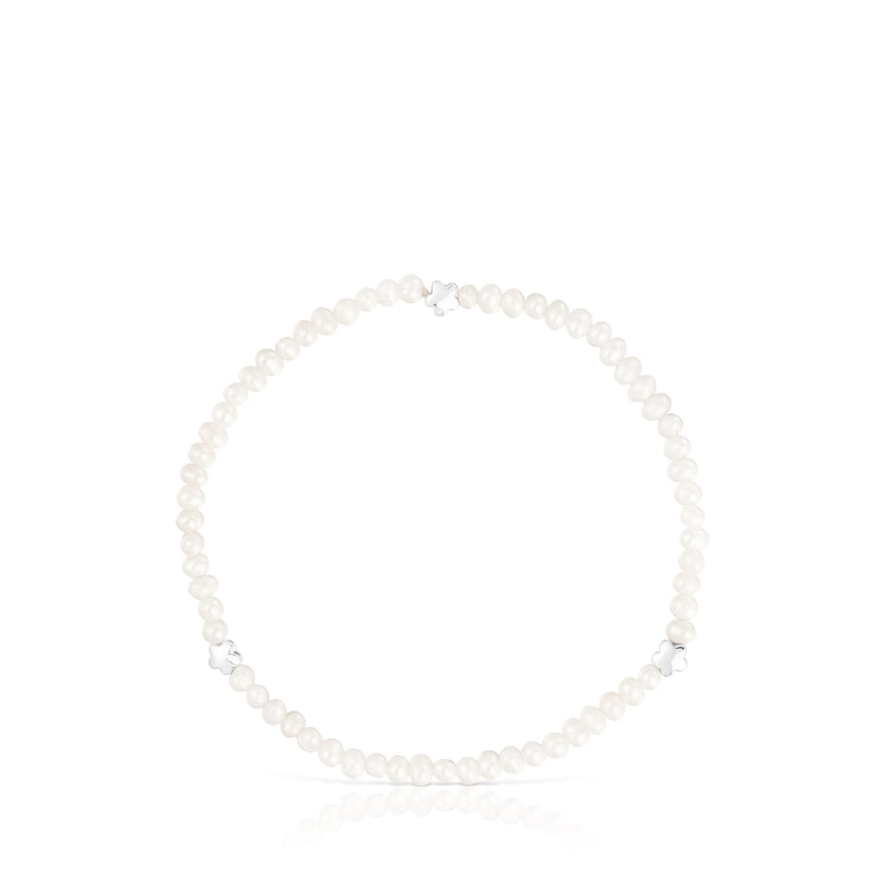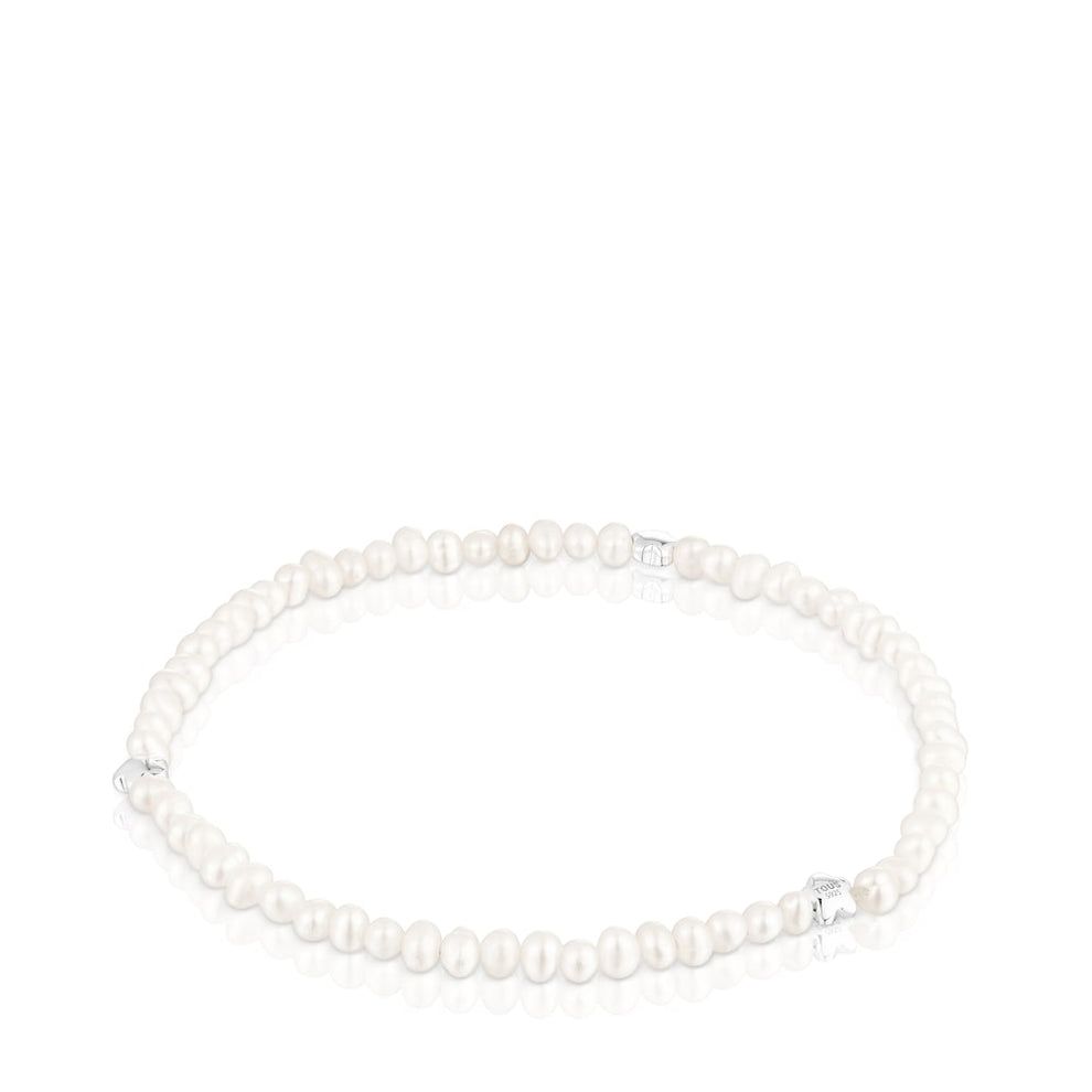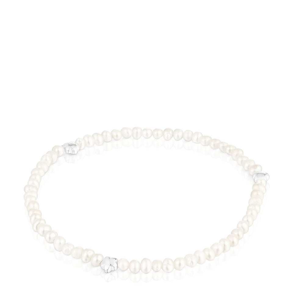 Elastic Bold Motif bracelet with cultured pearls and three alternating flower motifs in sterling silver. Size of the cultured pearls 3-3.5mm. Size of the flower 4mm. Bracelet length 17.5cm.