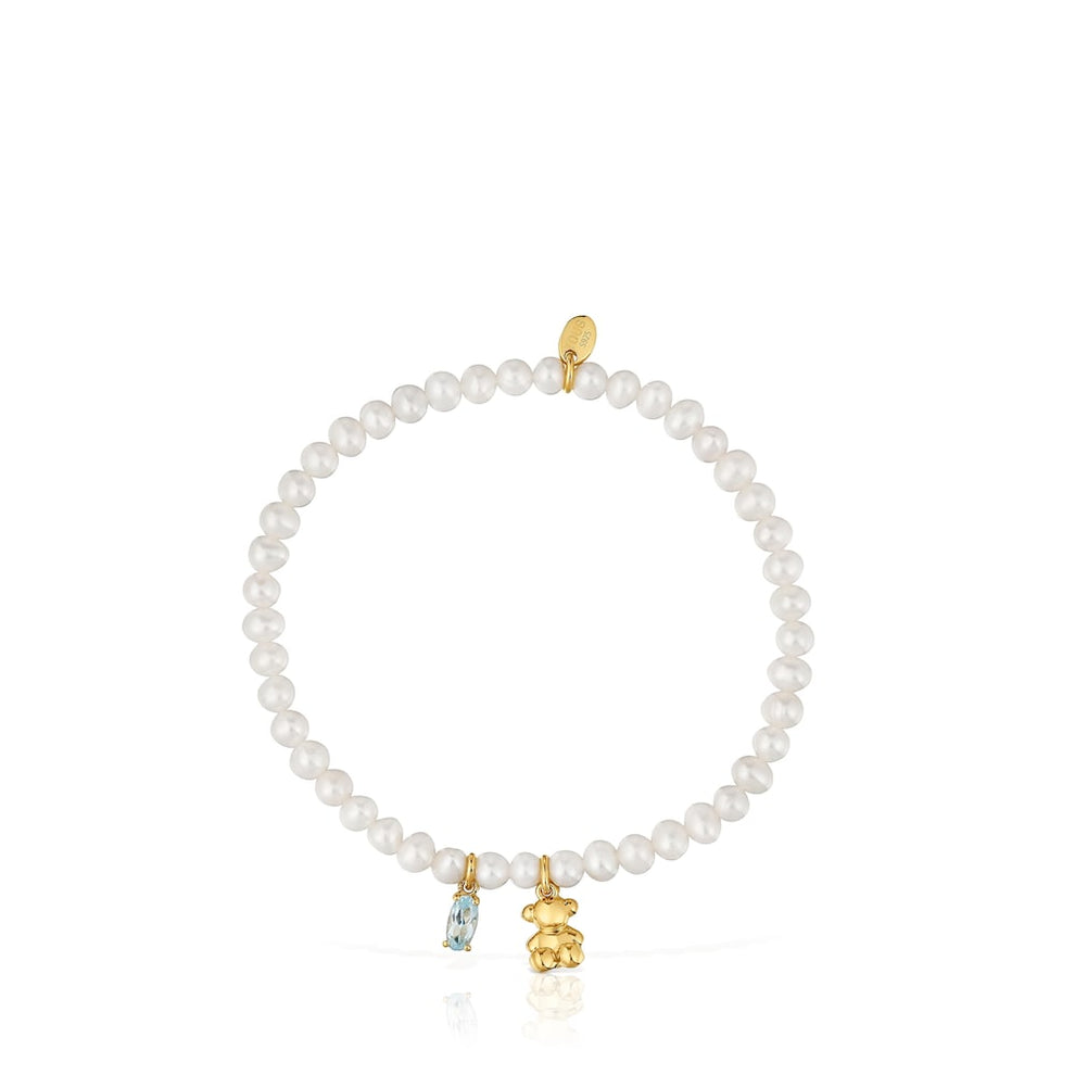 Bold Bear elastic bracelet with 18 kt gold plating over silver, cultured freshwater pearls and faceted blue topaz. Size of the cultured pearl 4-4.5mm. Size of the topaz 6x3mm. Size of bear 8mm. Bracelet length 16.5cm. It is made of sterling silver with 18to23kt gold plating and has a thickness of 3microns. This quality guarantees a greater durability of the jewel.