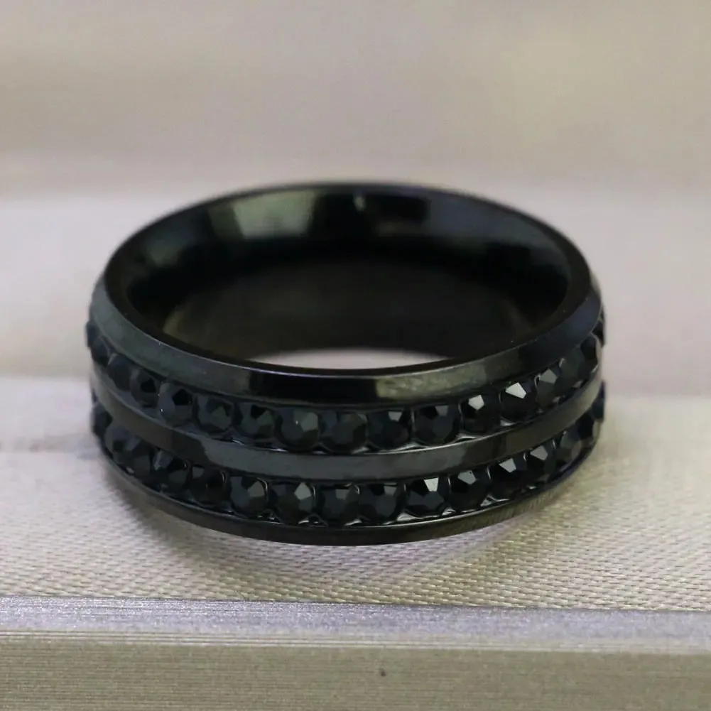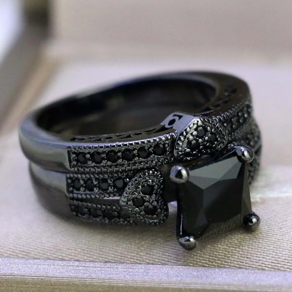 Fashion Couple Rings Women Black Heart Crystal CZ Rings Set Men's Two Rows Black CZ Stone Stainless Steel Ring Wedding Jewelry