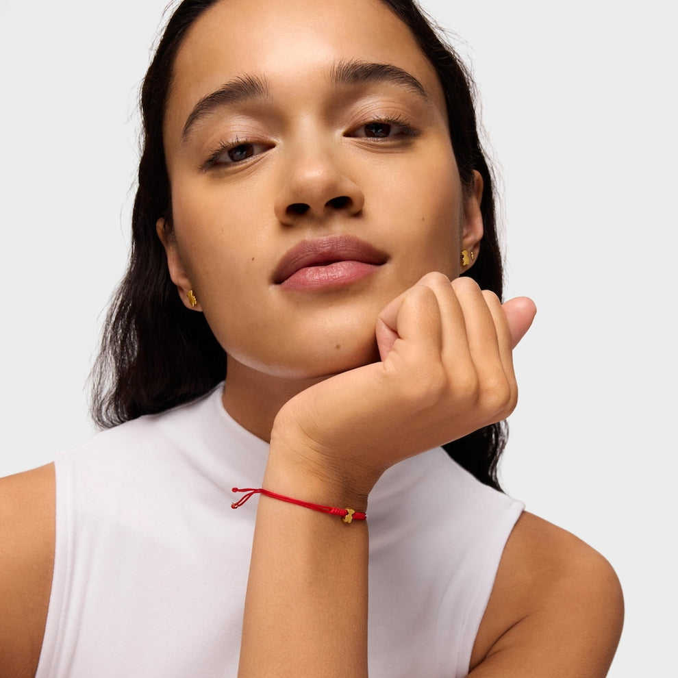 Red nylon Sweet Dolls bracelet with 18kt gold bear motif. Motif size 6mm. Bracelet length 17 cm. Slider clasp.