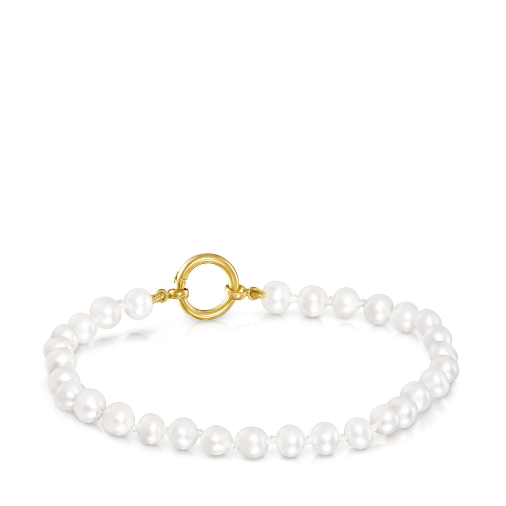 Hold bracelet with 0.5-cm pearls and ring in 18kt yellow gold. Size 1.2cm. Length 17.5cm. Customize it with pendants, tinys or rings.You can buy the Hold bracelet in gold with pearls through Touss online store. Find out how easy it is to buy Tous pendants.