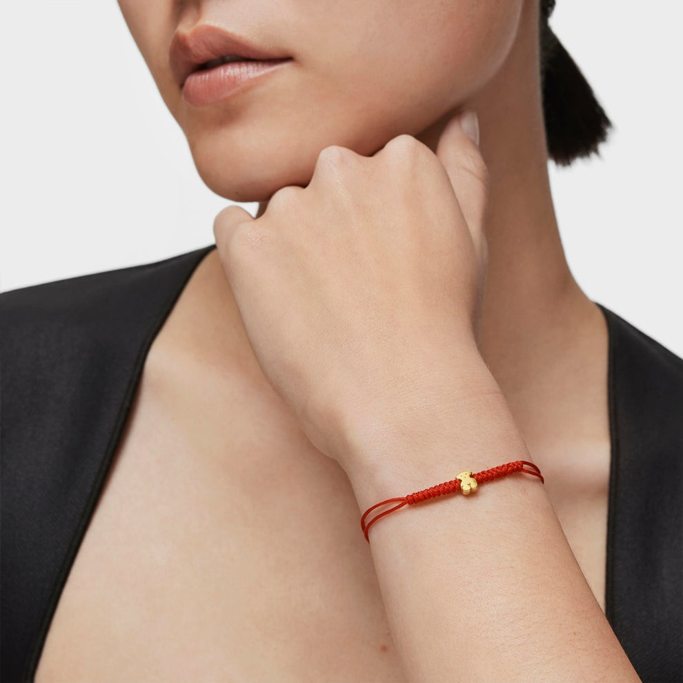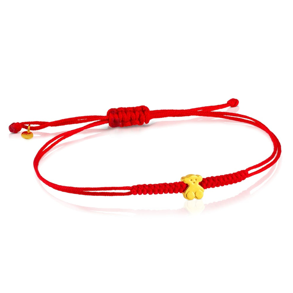 Sweet Dolls bracelet in 24kt yellow gold with red nylon cord.