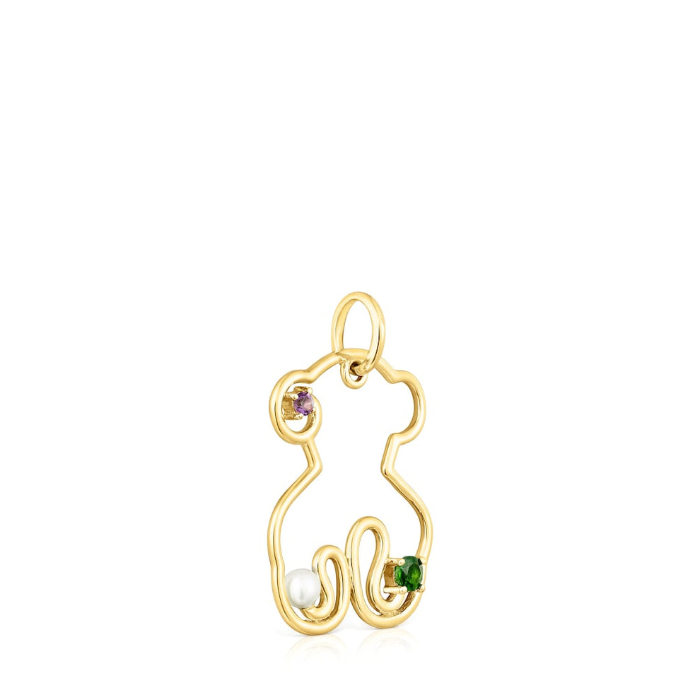 Tsuri Bear pendant in gold with gemstones and a cultured pearl. The gemstones are mounted around the silhouette of the bear. Gemstones amethyst and chrome diopside. Size of the gemstones 1.75x2.5mm. Size of the cultured pearl 3mm. Size of the bear 20mm. This item does not include the chain.You can buy the gold Tsuri Bear pendant with gemstones and a cultured pearl at the online store. Find out how easy it is to buy pendants at .