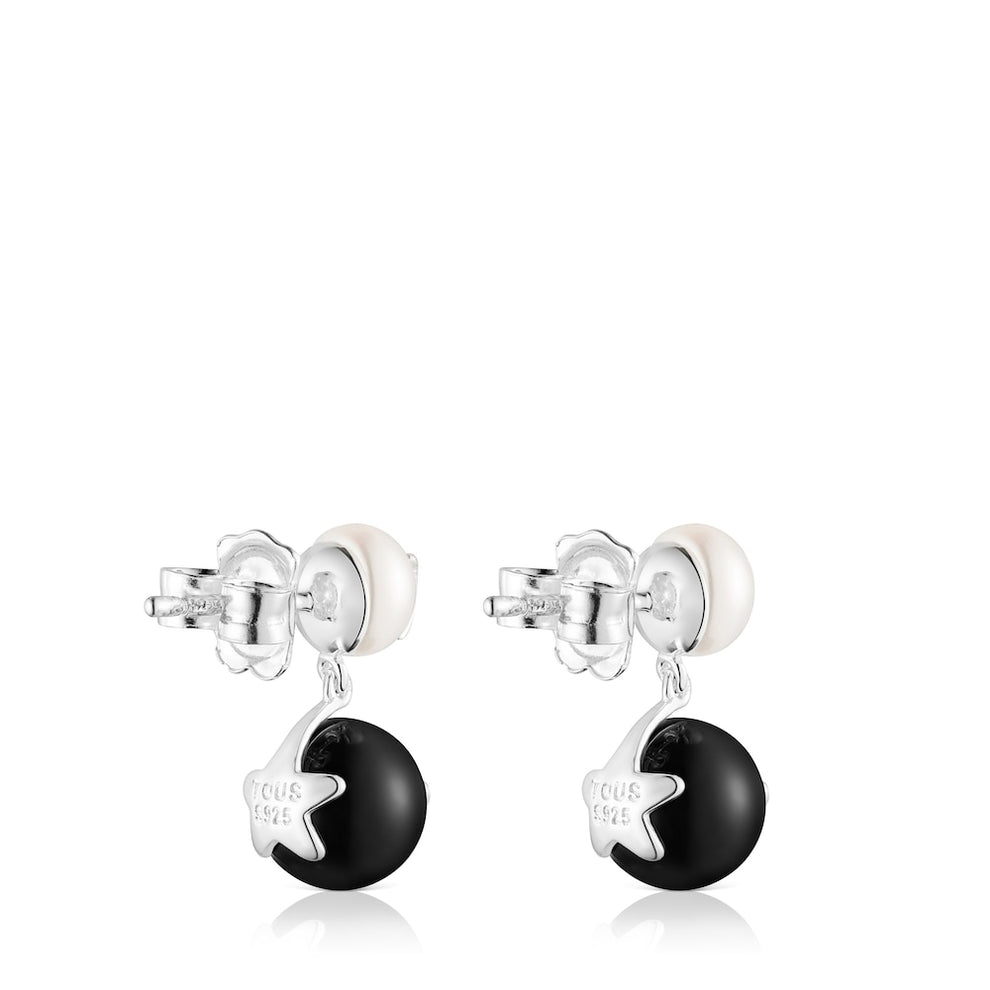 Magic Nature earrings in sterling silver with 6mm cultured freshwater pearl with moon and 8mm onyx with star. Push back. Production technique Casting.