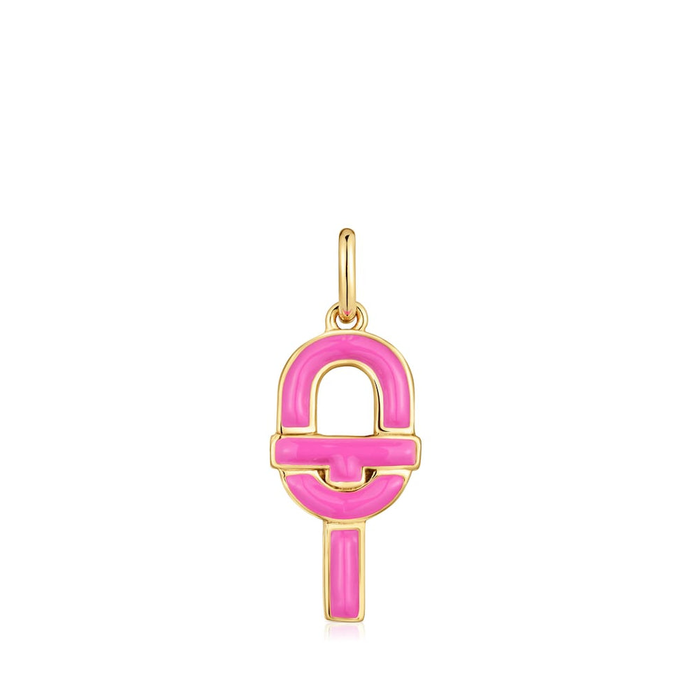 Medium MANIFESTO pendant with 18kt gold plating over silver and pendant charm with fuchsia-colored enamel. Pendant size 19mm. This item does not include the chain. Piece made of sterling silver with 18 to 23kt gold plating and has a thickness of 3microns. This quality guarantees a greater durability of the jewel. Note hand-painted enamel.