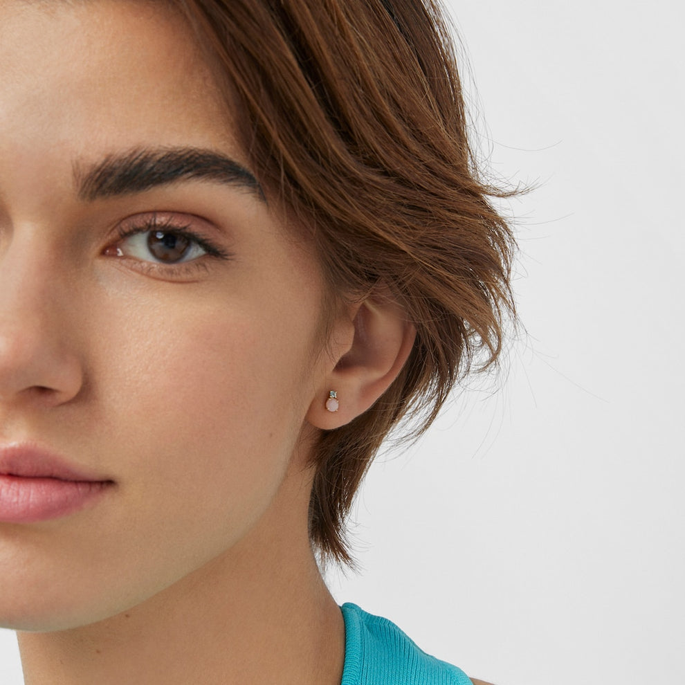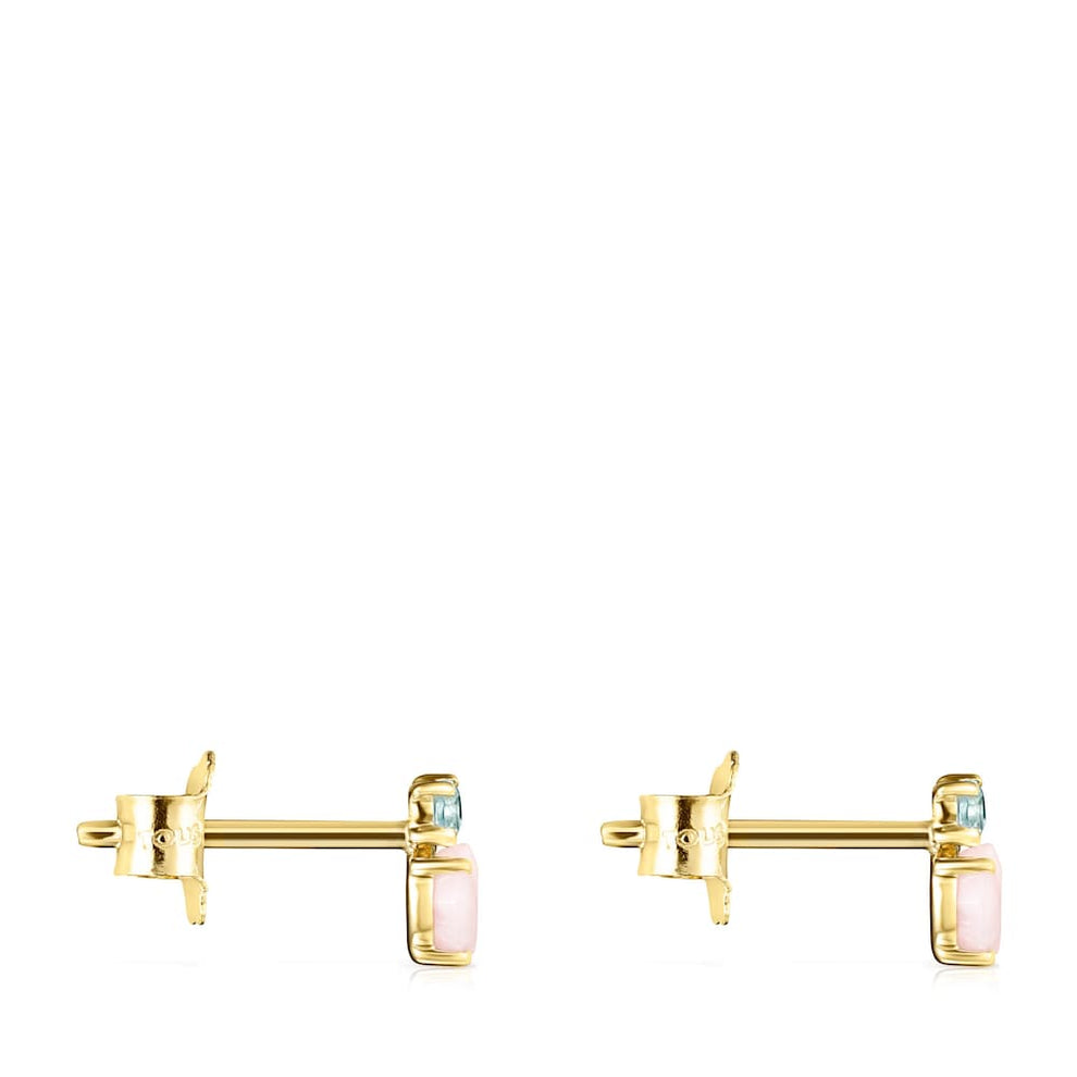 Mini Ivette Earrings in 18kt yellow gold with pink opal and blue topaz. Push back. Size 0.6 cm.You can buy the Mini Ivette Earrings in Gold with Opal and Topaz .