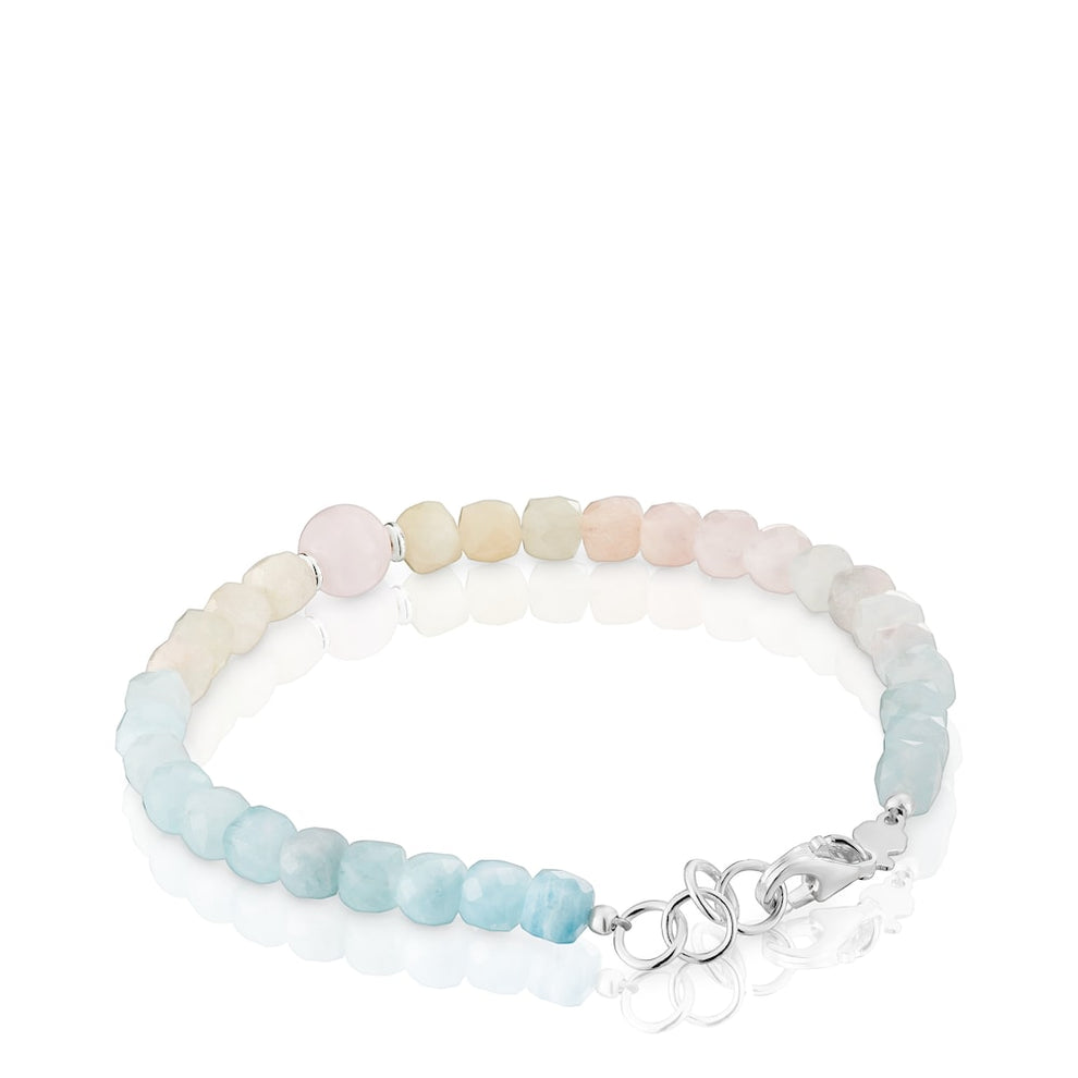 Ball bracelet in sterling silver, with faceted beryllium and a central rose quartz ball TOUS Basic Colors. Gemstones rose quartz, morganite in pink hues, aquamarine in blue hues and beryllium in other colors. Gemstone size beryllium 4.5mm, central rose quartz ball 6-6.5mm. Bracelet length 18cm. Lobster clasp.You can buy the rose quartz and multicolored beryllium ball Bracelet Basic Colors at the online store