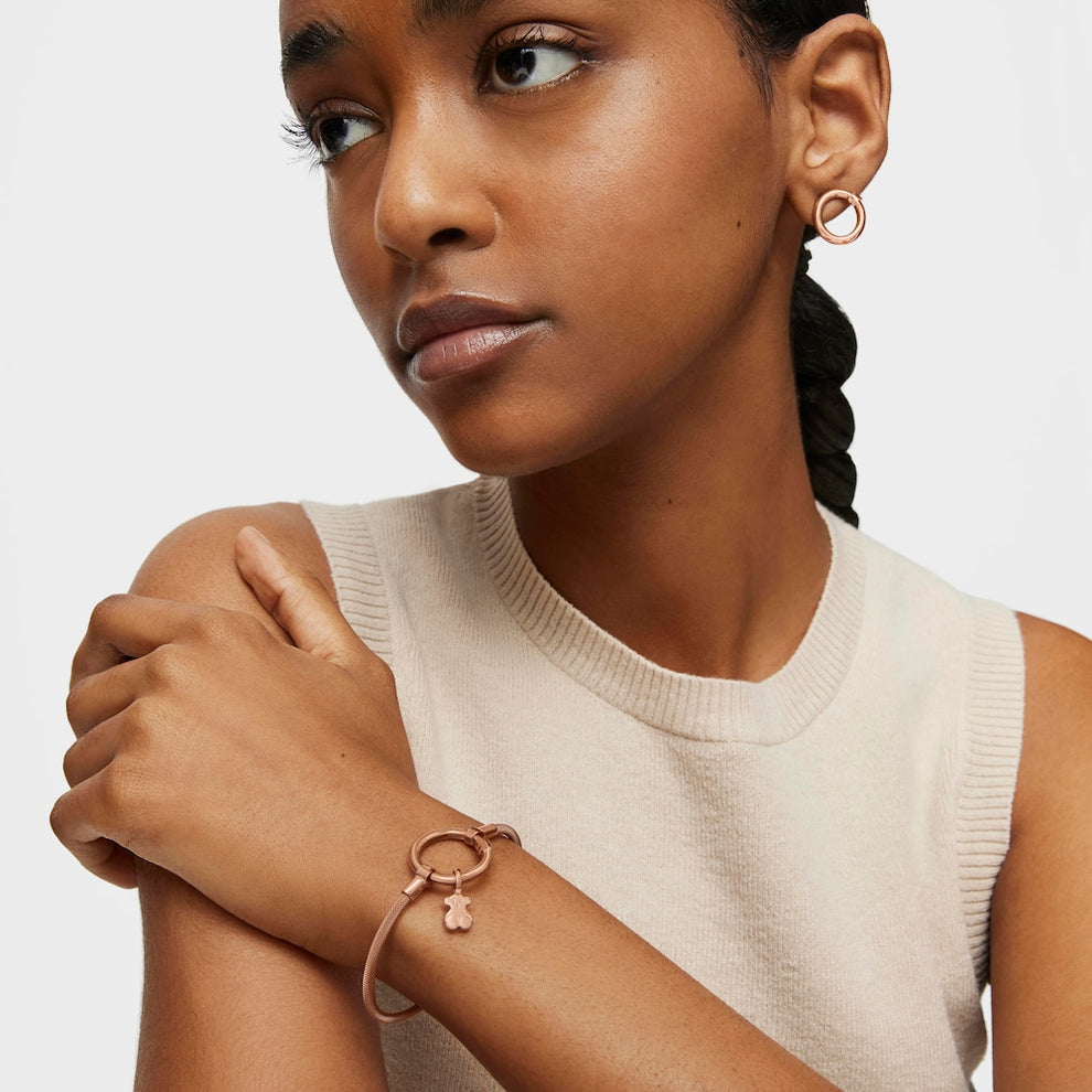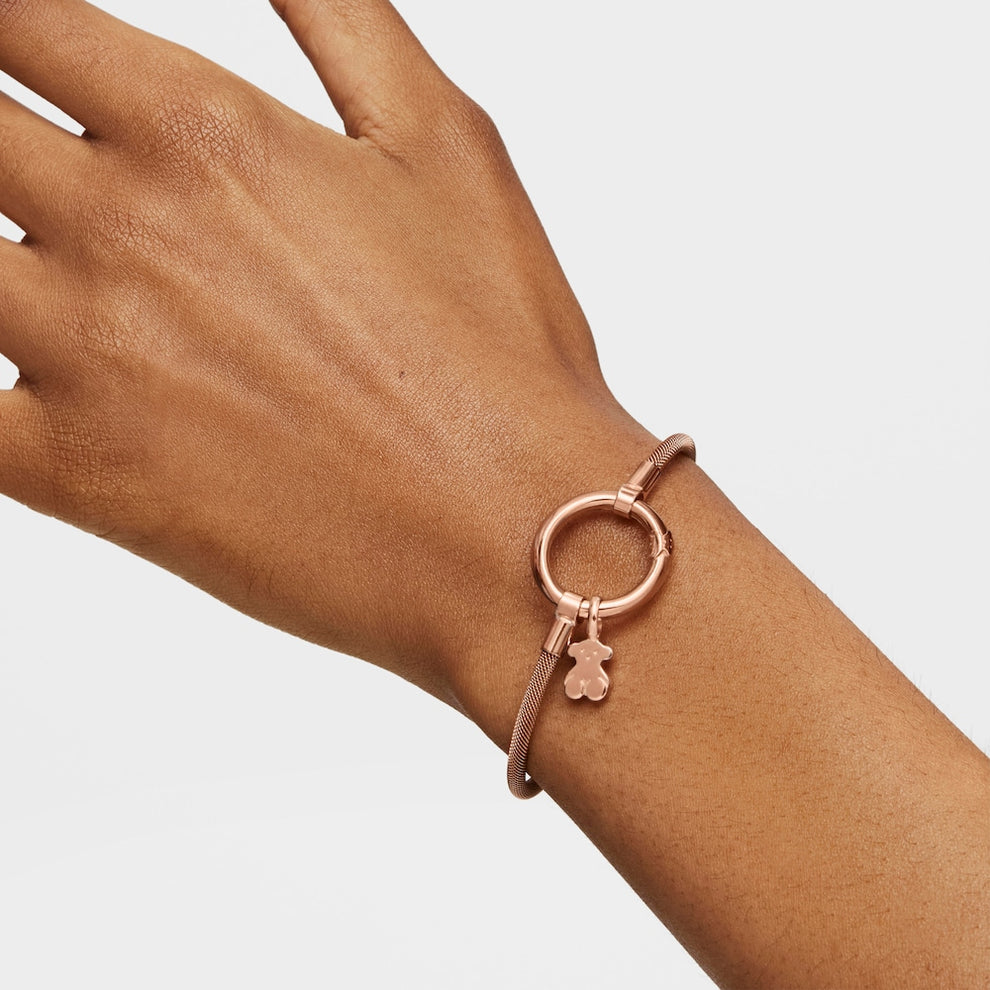 Hold bangle in rose vermeil silver and rose IP steel. Ring 2cm. Bear 0.9cm. Customize it with pendants, tinys or rings. Vermeil sterling silver plated with a layer of 18kt yellow rose gold.