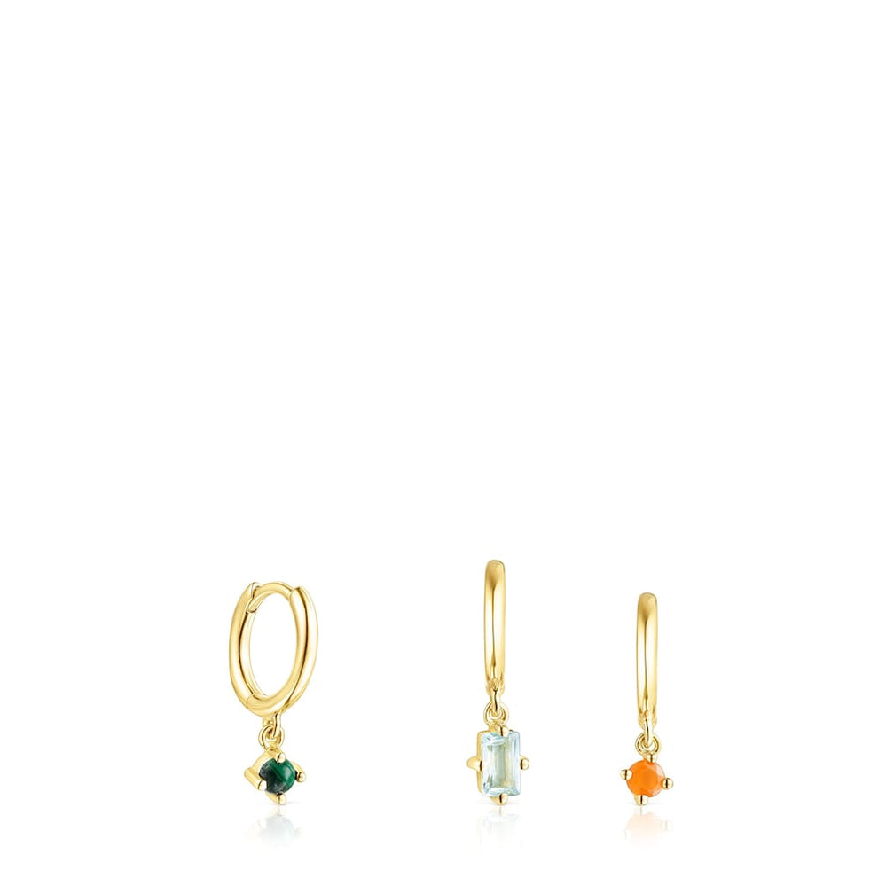 Set of three Good Vibes earrings in silver vermeil with 3mm round malachite cabochon, 5x3mm rectangular faceted blue topaz baguette and 3mm faceted round carnelian. 11mm. Hoop clasp. Sterling silver plated with 18kt gold with a thickness of 3 to 5 microns and with no other metal between them. Production technique Casting.
