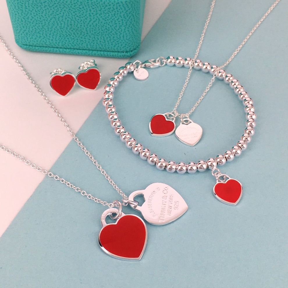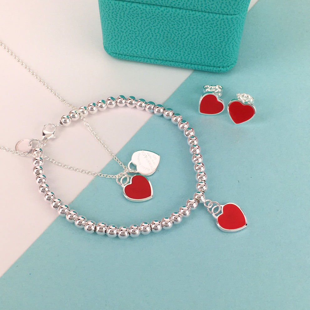 Set of Tiffany & Co Return to Tiffany Small Red Heart Stud Earrings Silver Necklace earrings Bracelet