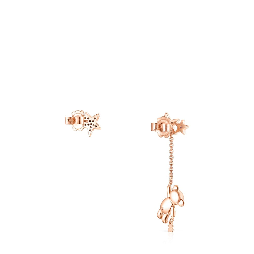 Teddy Bear Stars earrings in rose silver vermeil; one short with an 8mm spinel star and a 4mm ruby star; and one long with a 1.4cm bear pendant with a 2mm ruby heart. Push back. Sterling silver plated with 18kt gold with a thickness of 3 to 5 microns and with no other metal between them. Production technique Casting.