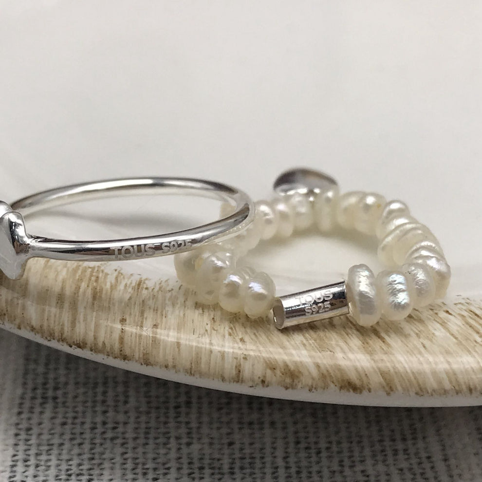 Silver and cultured pearls Mini Icons heart and bear Ring set