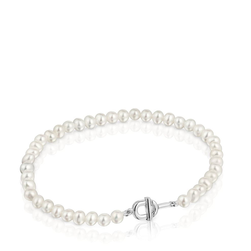 MANIFESTO bracelet in sterling silver with cultured pearls. Size of the cultured pearls 4.5-5mm. Special MANIFESTO closure in sterling silver. Size of the clasp 12x6.25mm. Bracelet length 17.5cm.