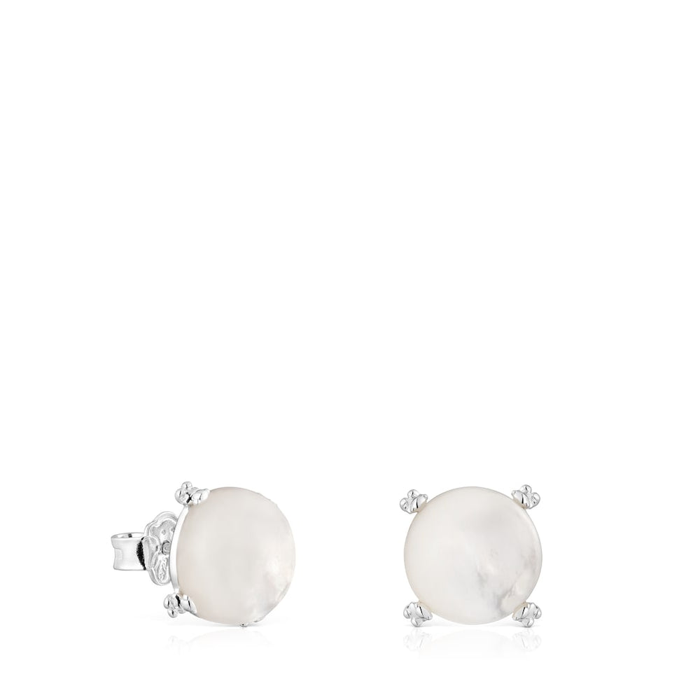 Color Pills earrings in sterling silver with round-cut mother-of-pearl cabochon. The mother-of-pearl stone is set within claws in the shape of the Bold Bear bear. Size of mother-of-pearl 10mm. Push back.
