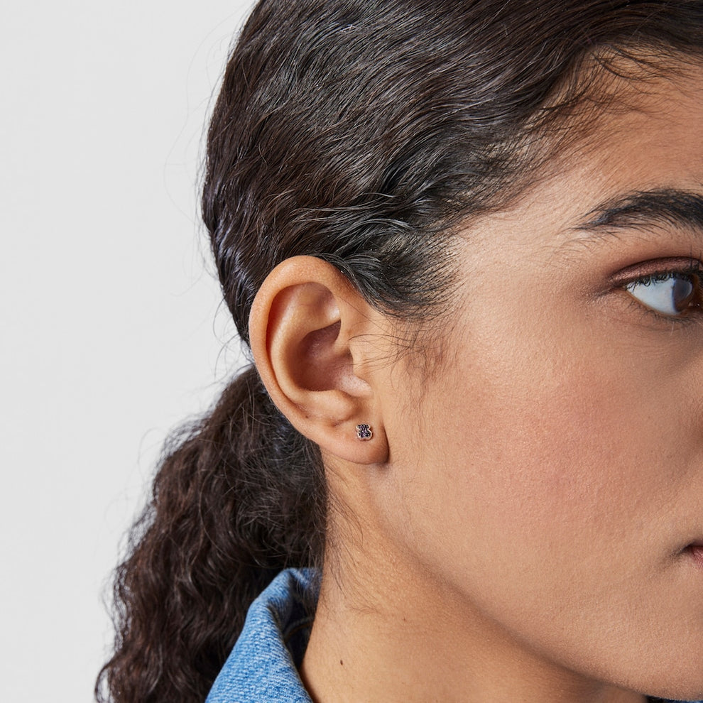 New Motif earrings in sterling silver with a bear motif in amethysts. Push back. Size 4.6mm x 3.8mm.You can buy the silver New Motif Earrings with amethyst bear