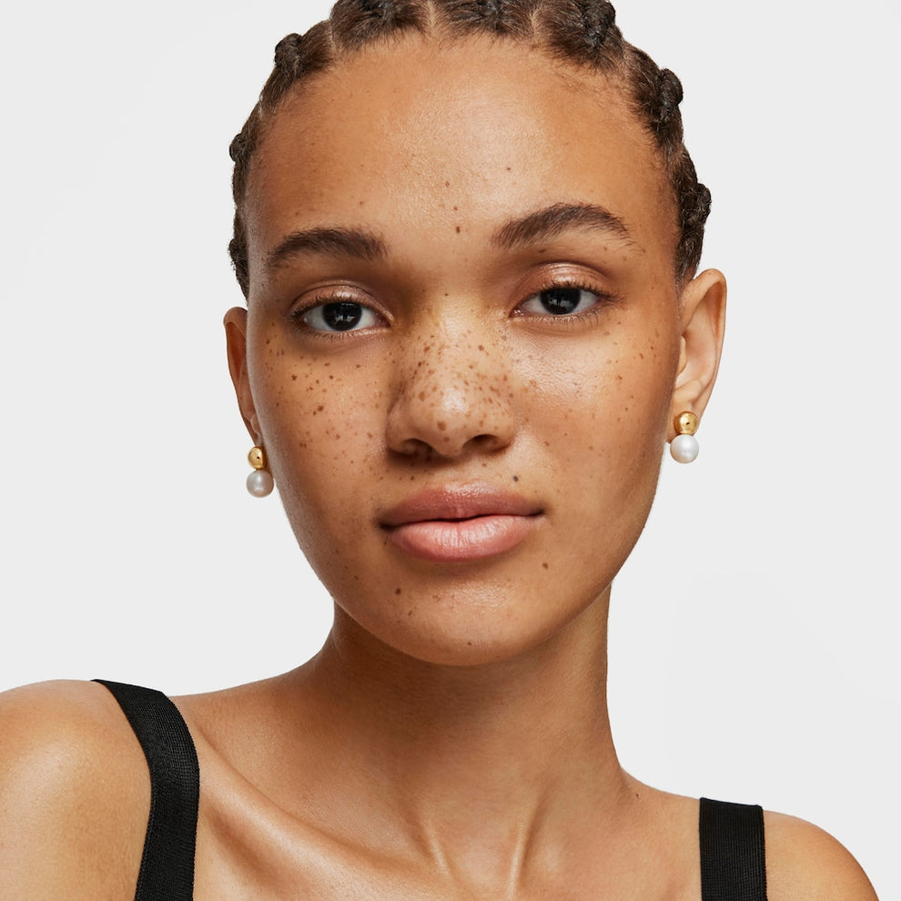 Gloss earrings in silver vermeil with 8mm ball and 10mm cultured freshwater pearl. Push back. Sterling silver plated with 18kt gold with a thickness of 3 to 5 microns and with no other metal between them. Production technique Mechanized.