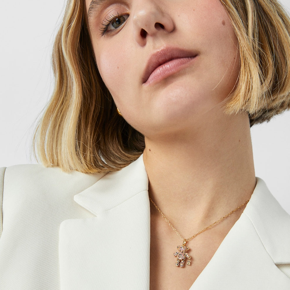 T Teddy Bear Gems pendant in silver vermeil with multicolored sapphires (blue, yellow, orange, pink and green) and 0.015ct HSI brilliant-cut diamonds. Size of bear 2.2cm. This item does not include the chain. Sterling silver plated with 18kt gold with a thickness of 3 to 5 microns and with no other metal between them. Production technique Casting.You can buy the silver vermeil Teddy Bear Gems pendant with sapphires at the TOUS online store. Find out how easy it is to buy pendants at .