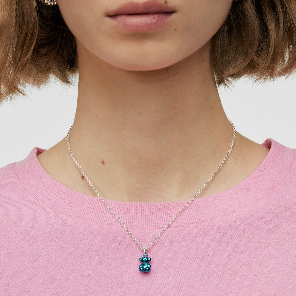 Small Bold Bear pendant in blue steel and a washer in sterling silver. Size of the bear 11mm. This item does not include the chain.