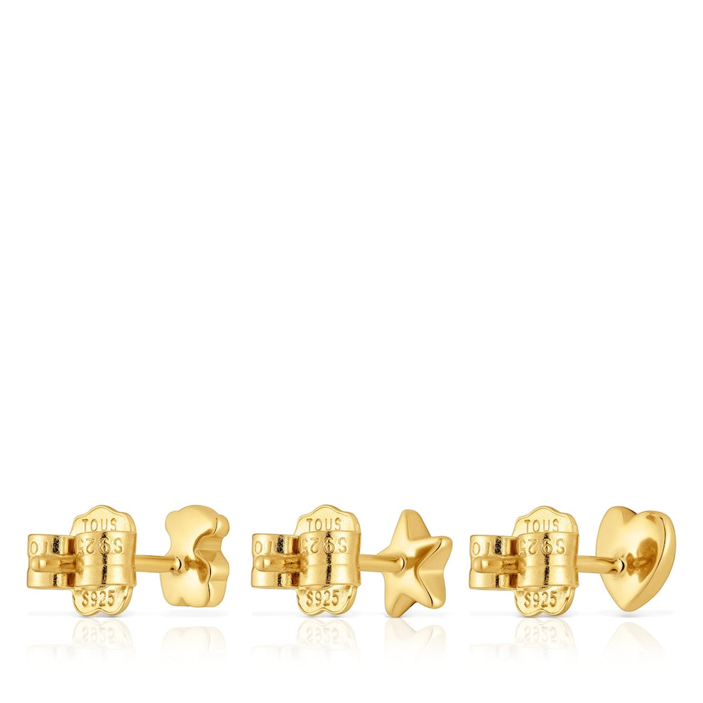 Pack of three Bold Motif 18kt gold plating over silver earrings with heart, bear and star motifs. Size of motifs 5.6mm. Push back. Piece made of sterling silver with 18to23kt gold plating and has a thickness of 3microns. This quality guarantees a greater durability of the jewel.You can buy the pack of three Bold Motif 18kt gold plating over silver Earrings with motifs at the online store. Find out how easy it is to buy earrings at .