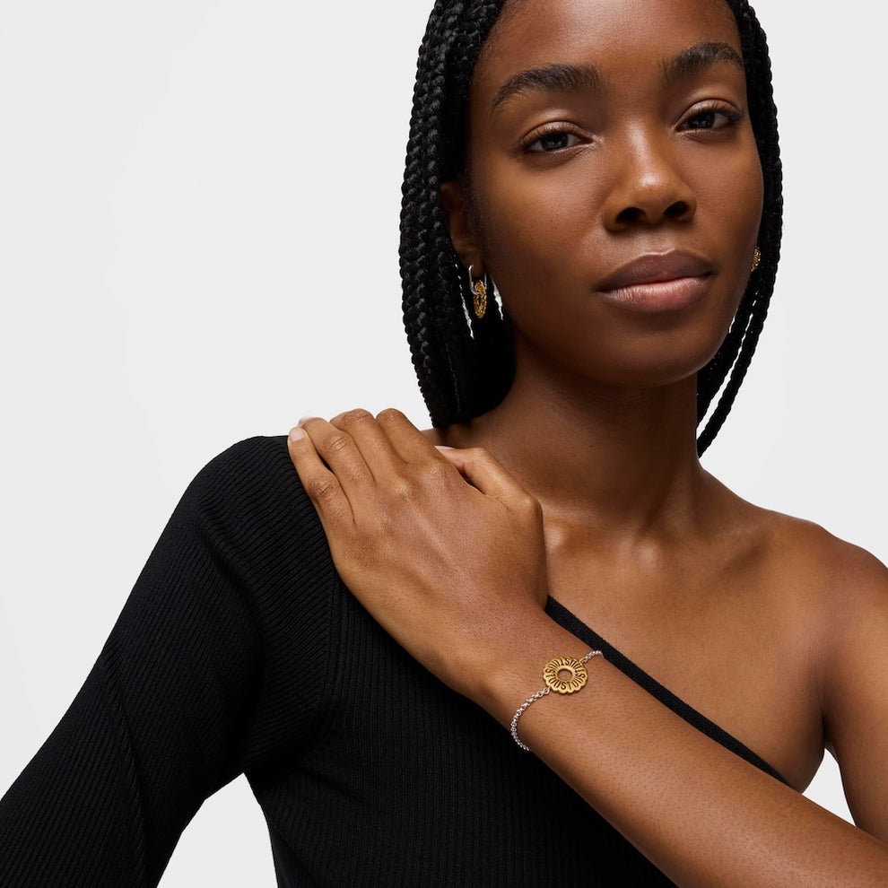 Miranda chain bracelet in sterling silver with 18kt gold plating over silver. Bracelet length 20cm. Motif size 20mm. Lobster clasp. Piece made of sterling silver with 18to23kt gold plating with a thickness of 3microns. This quality guarantees the piece will have greater durability.